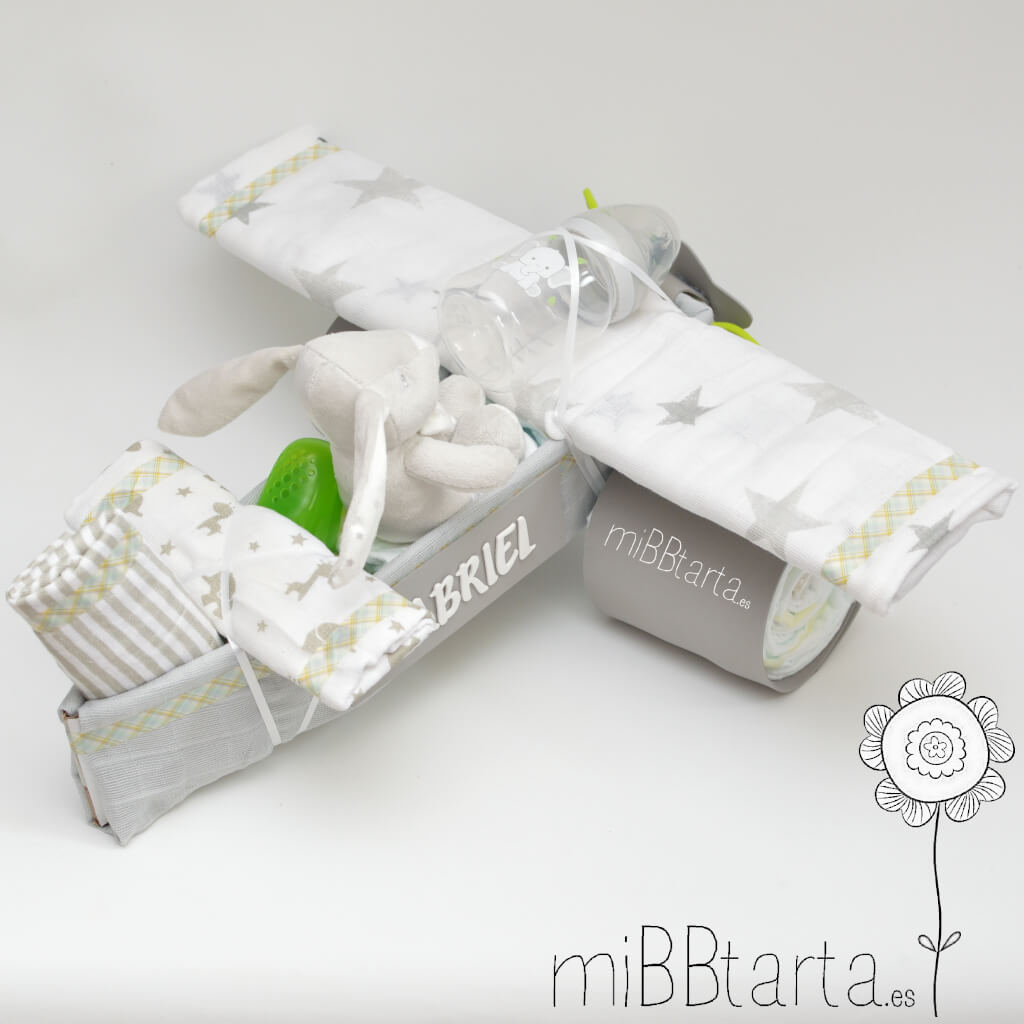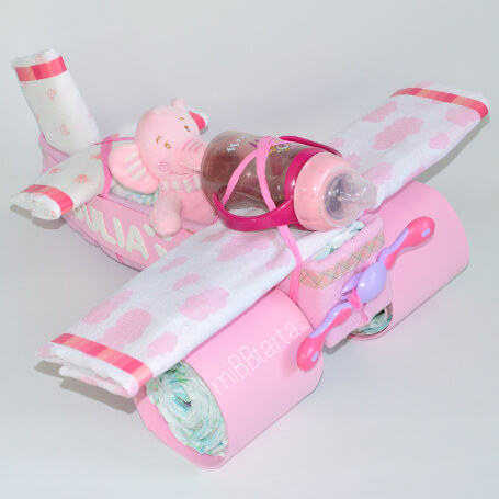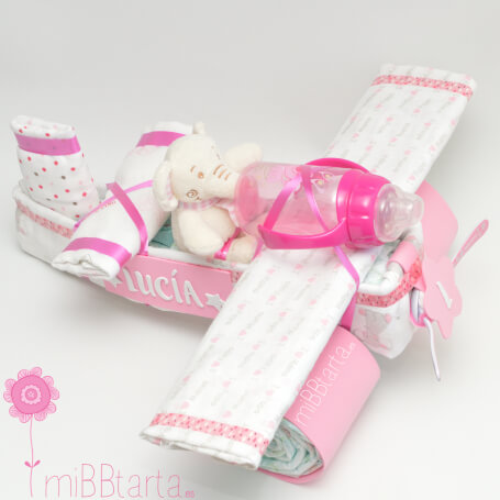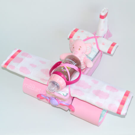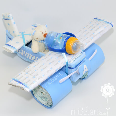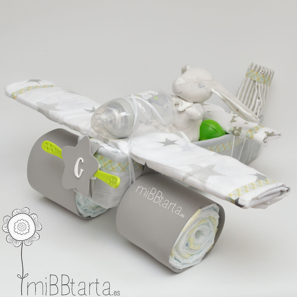 - Tu Avión de pañales llegará envuelto en papel de celofán decorativo con un lazo y la tarjeta de felicitación con todo lo que lleva.