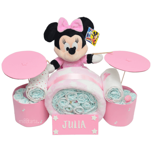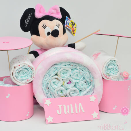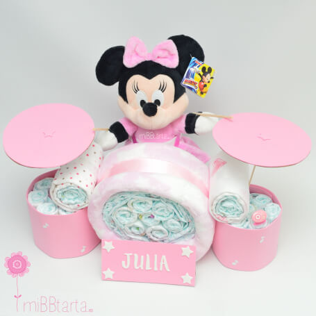 ¡Una tarta de pañales muy especial para hacer un regalo muy sonado 🙂 ! ¿Quieres ser la/el primer@ en regalarle un peluche de Minnie? Un regalo personalizado y muy práctico para dar la bienvenida al bebé.
