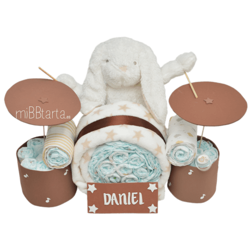 Y si en lugar de una figura hecha con pañales prefieres una tarta de pañales o una canastilla en regalos originales para bebés recién nacidos encontrarás más ideas.