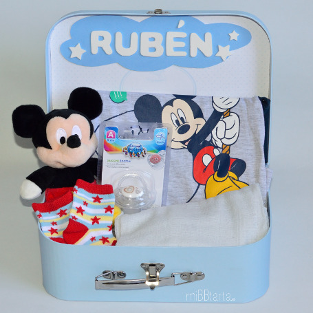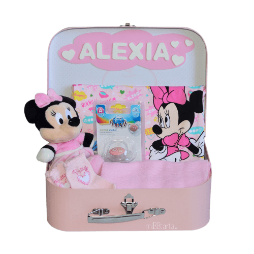 La Canastilla bebé Pelele Mickey – Minnie es un maravilloso regalo para los bebés nacidos en los meses de verano. Su precioso y fresquito pelele está decorado con los entrañables personajes Mickey o Minnie, que también aparecen en esta canastilla en forma de un tierno peluche de bebé. Todo esto junto con el resto de regalitos en una maletita personalizada te ayudarán a darle una increíble bienvenida al recién nacido.