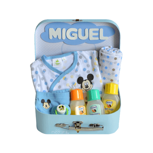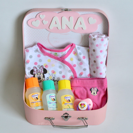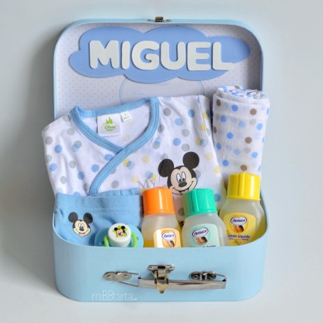 Una bonita cesta para el bebé con un conjuntito de recién nacido con los entrañables y tiernos Mickey o Minnie, para aquellos bebés que han nacido en los meses de verano.