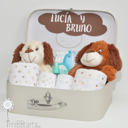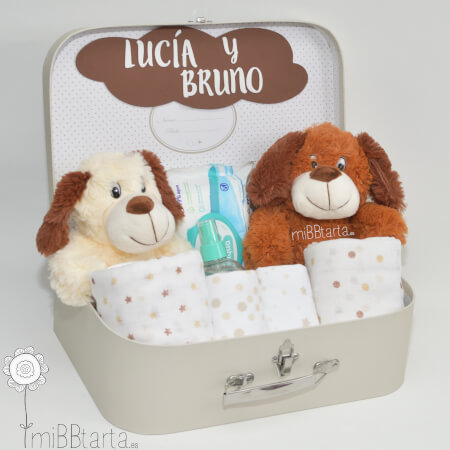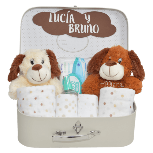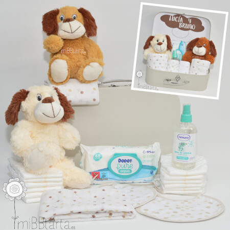 - La Canastilla para gemelos unisex Perritos llegará envuelta en papel de celofán decorativo con un lazo y la tarjeta de felicitación con todo lo que lleva.