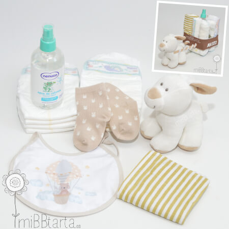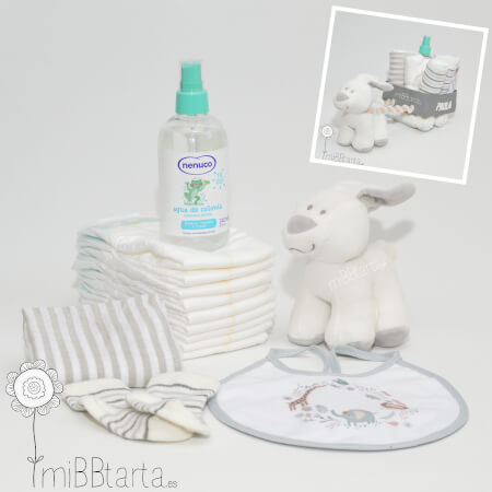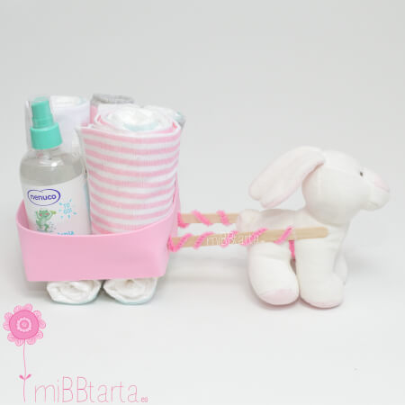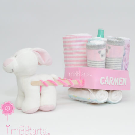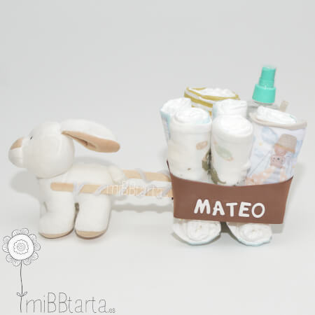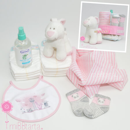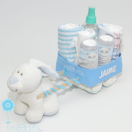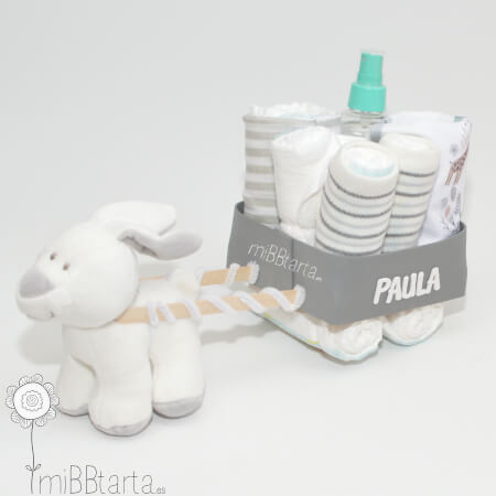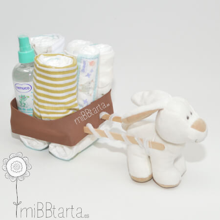 Con nuestro divertido carro de pañales podrás hacer un regalo de nacimiento original y personalizado lleno de detalles para el recién nacido y de gran utilidad.