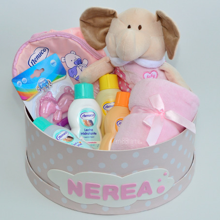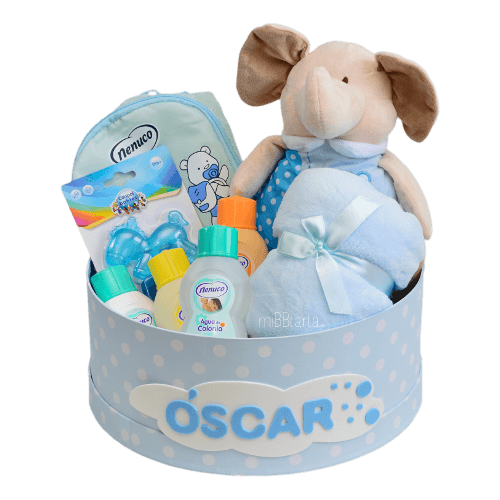 La Cesta de bebé Elefantito de lunares es un regalo de nacimiento muy práctico, con un peluche que acompañará al recién nacido los primeros años de su vida y un mordedor con el que jugará y le aliviará cuando le empiecen a salir los dientes. A los papás la mochila Nenuco con todo lo que lleva les vendrá genial porque la utilizarán casi desde el primer día, tanto para llevar cositas del bebé como en el momento del baño y la sombrerera puede convertirse en una bonita caja de recuerdos.