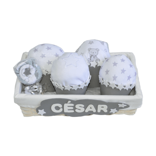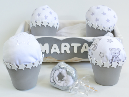 La Cesta de Cupcakes de pañales es un regalo de nacimiento súper original. Una bonita bandeja de mimbre personalizada con el nombre del bebé y llena de 4 cupcakes y una piruleta muy dulces y sobre todo útiles gracias a su relleno de pañales y ropita.