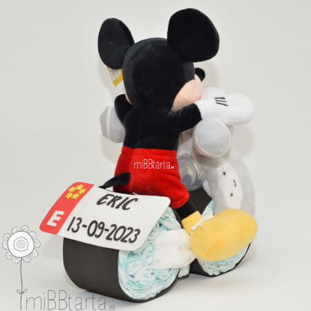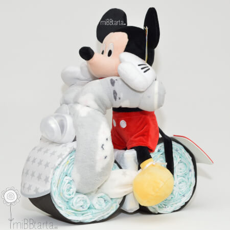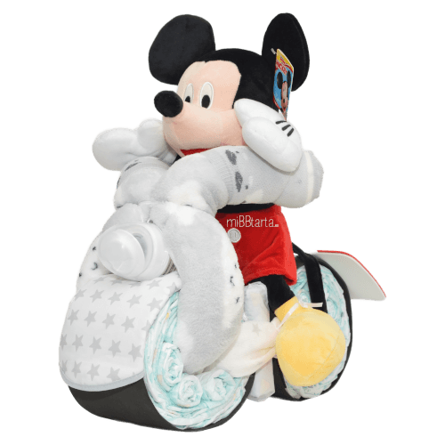 Las motos de pañales nos encantan por eso pensamos en hacer una un poquito más especial y lo hemos conseguido con la Moto de pañales Mickey Minnie. Un regalo original, práctico y divertido con los tiernos peluches de Mickey o Minnie que lo hacen todavía más especial. Estos bonitos peluches están preparados para acompañar al bebé desde sus primeros días, así que seguro que se convierten en amigos inseparables. Un bonito regalo de nacimiento con el que siempre acertarás.
