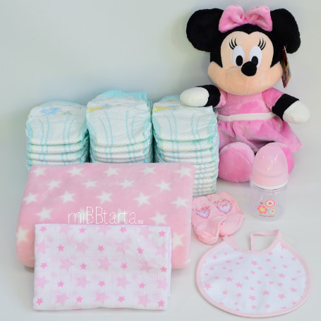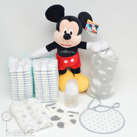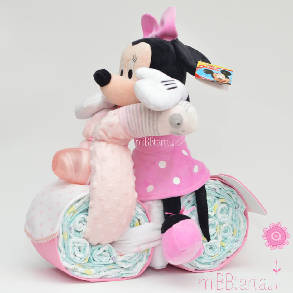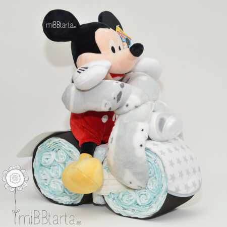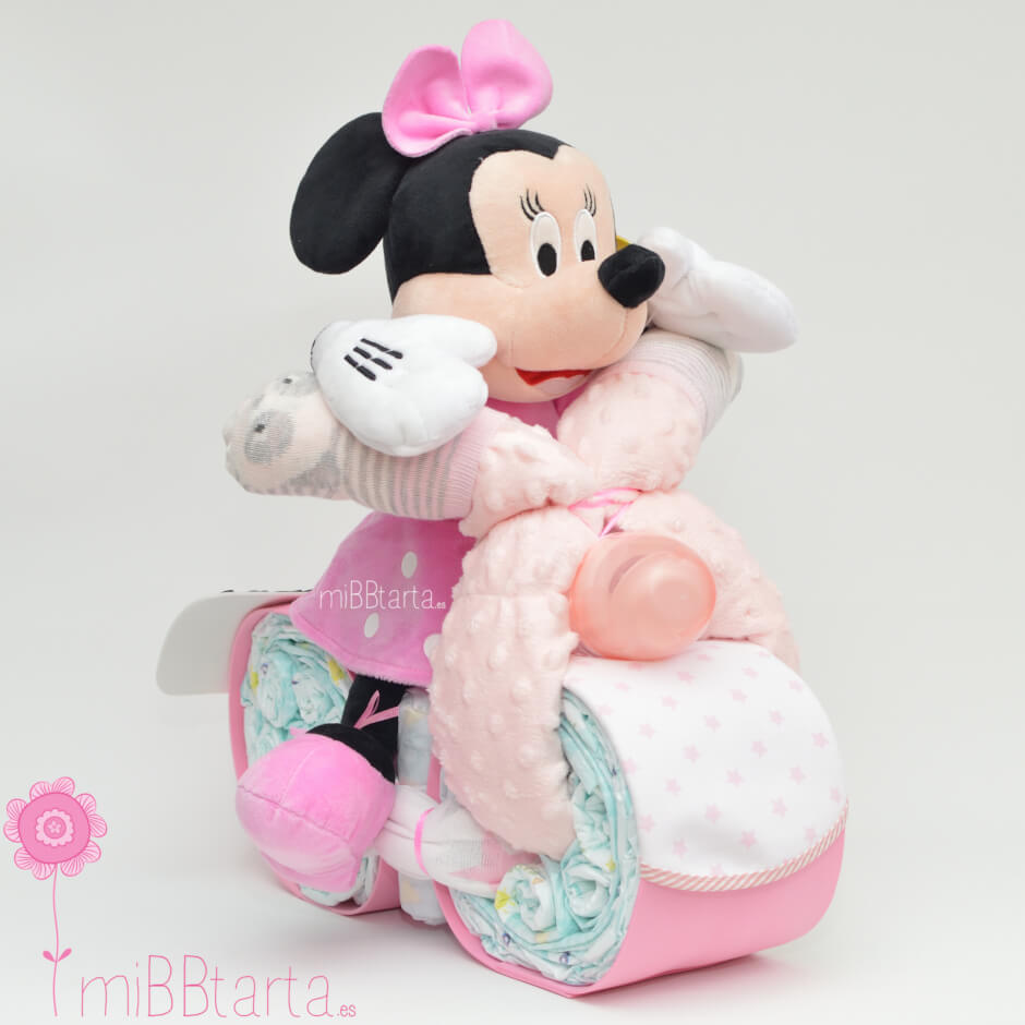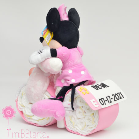 - Tu Moto de pañales Mickey Minnie llegará envuelta en papel de celofán decorativo con un lazo y la tarjeta de felicitación con todo lo que lleva.