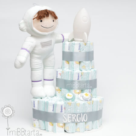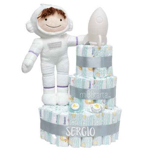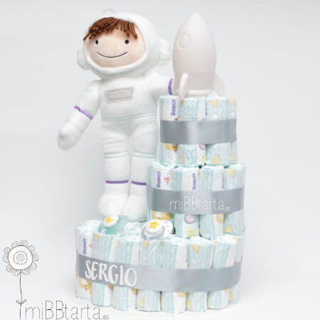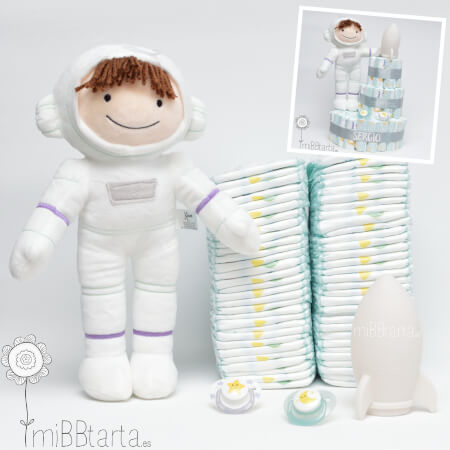 - Tu Tarta de pañales Astronauta llegará envuelta en papel de celofán decorativo con un lazo y la tarjeta de felicitación con todo lo que lleva.