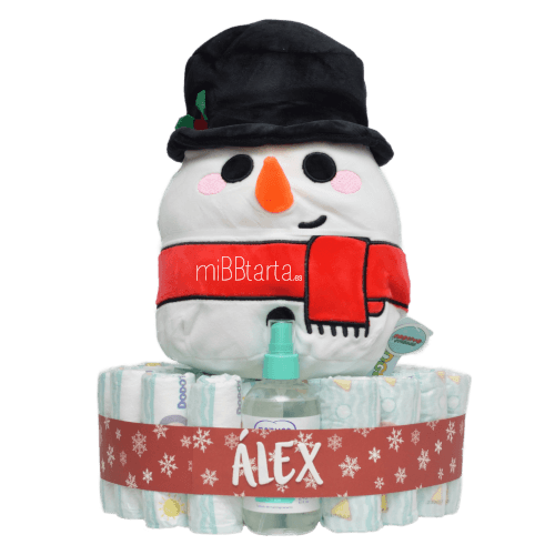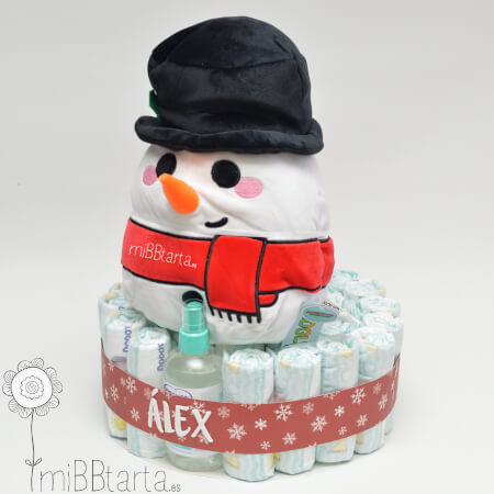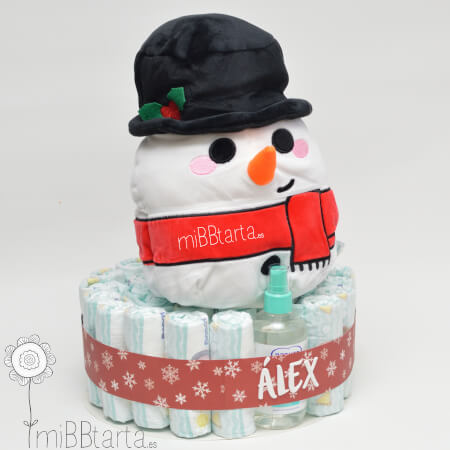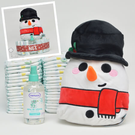 ¿Acaba de nacer el bebé cerquita de Navidad y quieres sorprender con un regalo de nacimiento original? ¿Buscas un regalo de Navidad para esos amigos o familiares que vas a visitar que tienen un bebé de 3, 6, 9 meses o 1 ó 2 añitos? Con la Tarta de pañales Mi Primera Navidad puedes hacer un regalo muy práctico para los papis, con pañales a elegir desde talla 2 hasta talla 4 y una colonia de Nenuco y a la vez darle un peluche de muñeco de nieve que sirva tanto como decoración navideña en el cuarto del bebé o como un juguete para él.