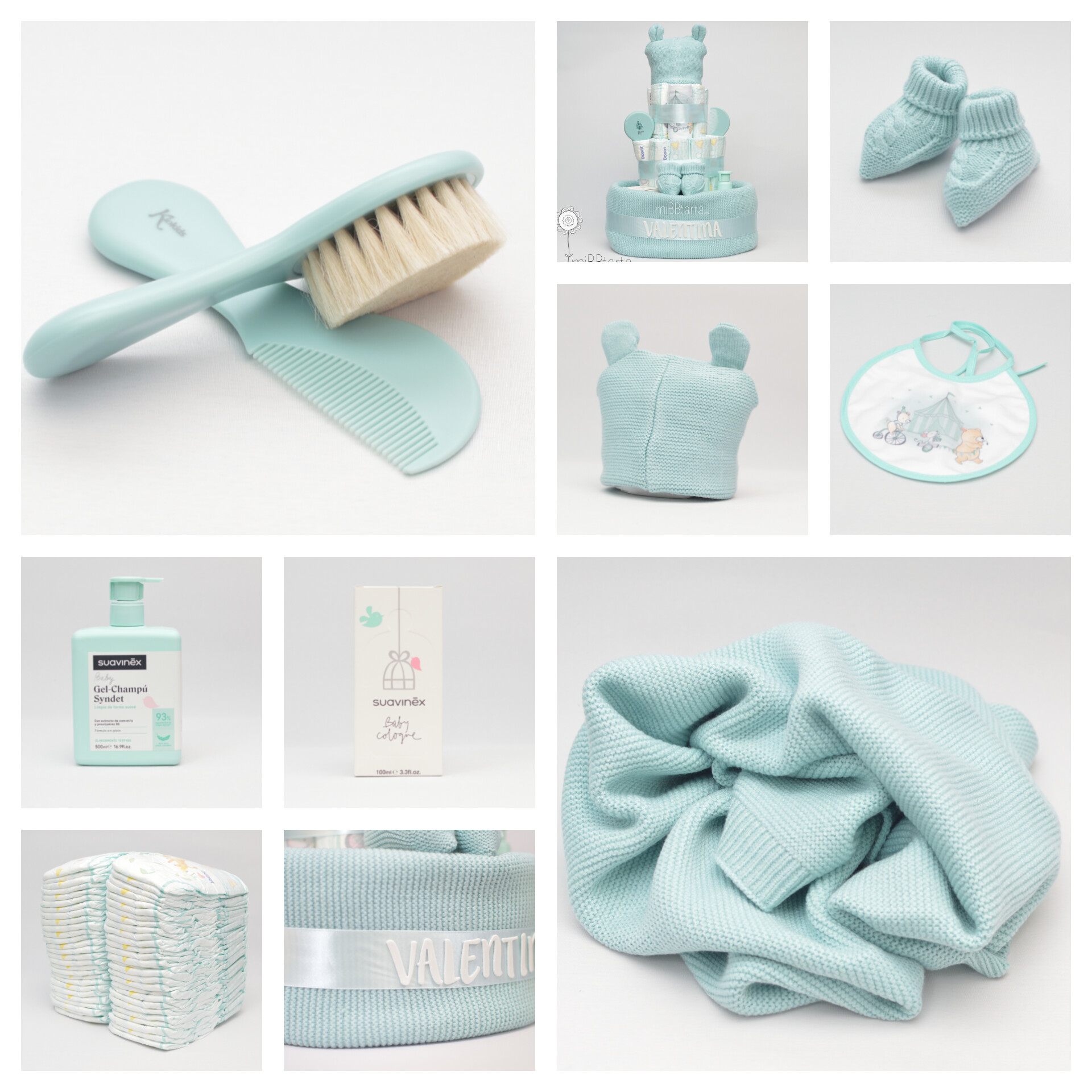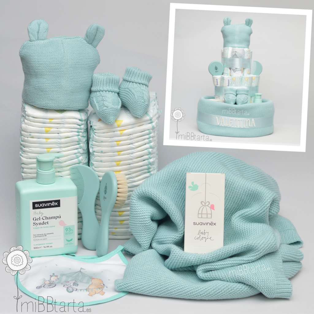 La tarta de pañales Suavinex es un regalo de nacimiento practiquísimo, con el agua de colonia Suavinex y el gel champú Suavinex el bebé olerá genial. El tacto de la mantita, los patucos y el gorrito no puede ser más blandito, ¡Les encantará!  Y junto con  el babero y el cepillo y peine a juego convierten a esta tarta de pañales en un regalo para el recién nacido muy práctico.