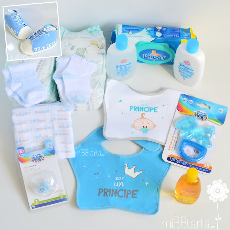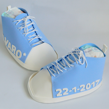 Todos nuestras tartas de pañales y canastillas puedes personalizarlas con el nombre del bebé, incluso algunas como estas zapatillas también puedes añadirle las fecha de nacimiento, ¡Entra en regalos para bebés personalizados! y descubre más ideas para hacer una regalo inolvidable.