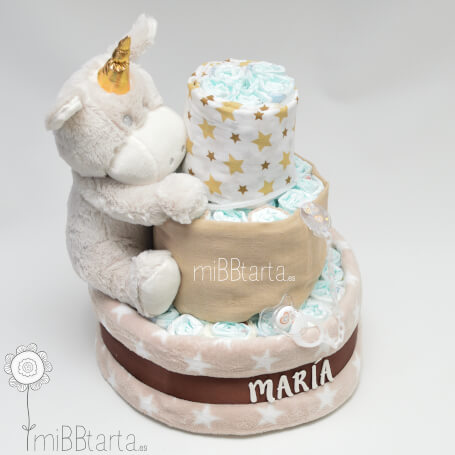 - Tu Tarta pañales Unicornio llegará envuelta en papel de celofán decorativo con un lazo y la tarjeta de felicitación con todo lo que lleva.