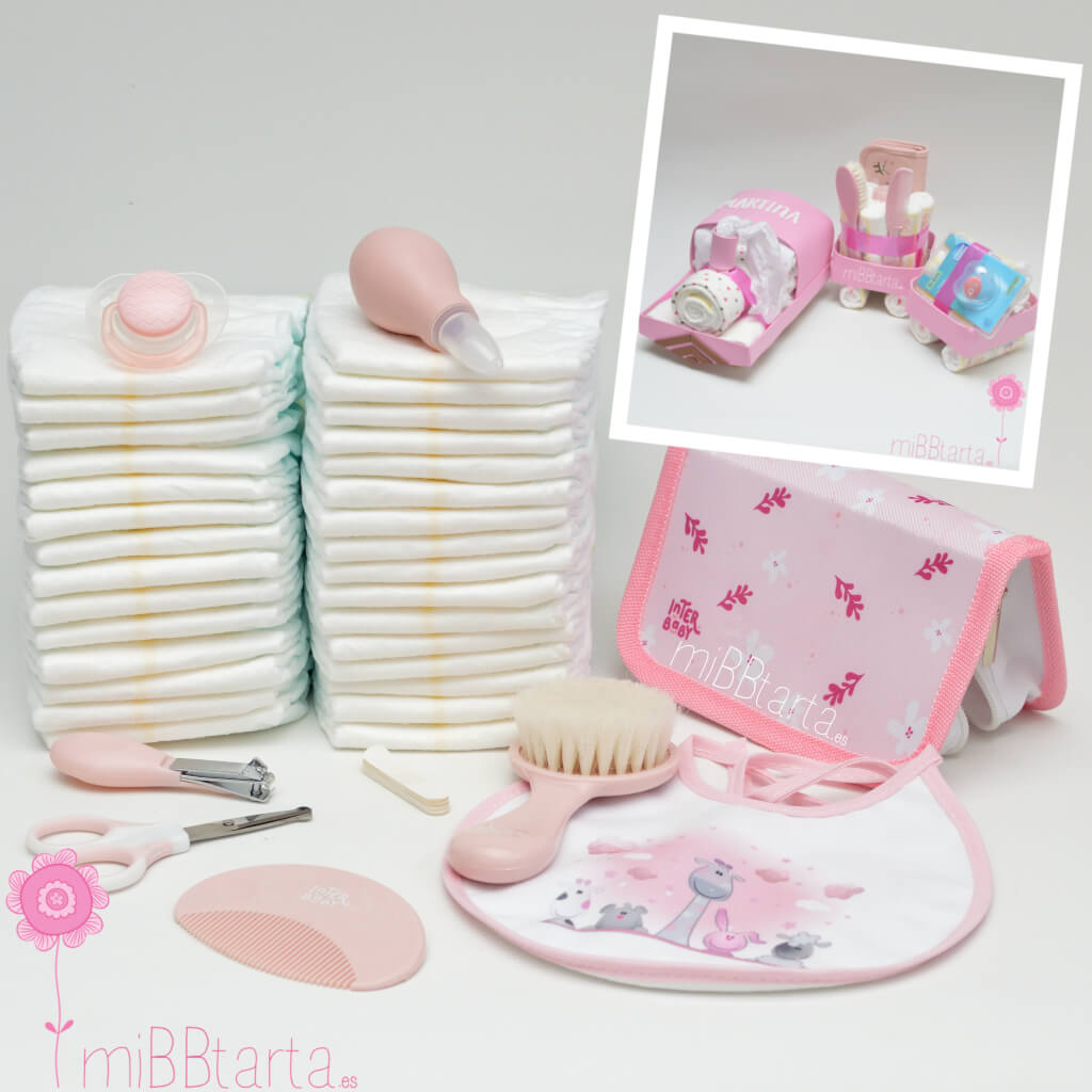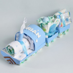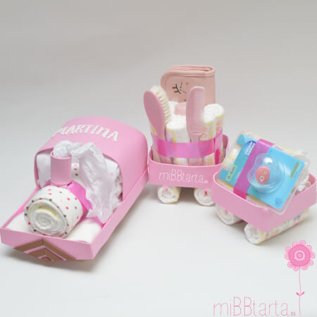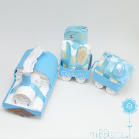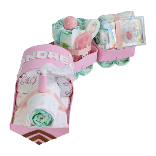 - Tu Tren de pañales con vagones llegará envuelto en papel de celofán decorativo con un lazo y la tarjeta de felicitación con todo lo que lleva.